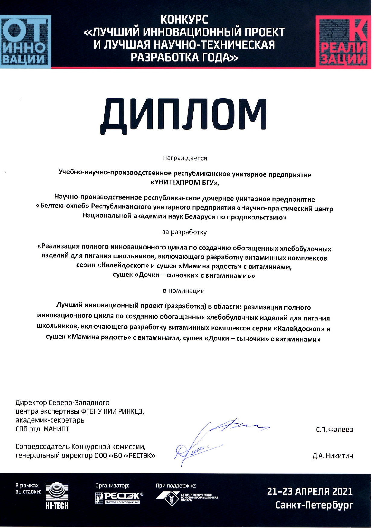 В номинации «Лучший инновационный проект (разработка) в области: реализация полного инновационного цмкла по созданию обогащенных хлебобулочных изделий для питания школьников, включающего разработку витаминных комплексов серии «Калейдоскоп» и сушек «Мамина радость» с витаминами, сушек «Дочки - сыночки» с витаминами» награждены Дипломом: Учебно-научно производственное республиканское унитарное предприятие «УНИТЕХПРОМ БГУ» в качестве научно-технологического парка, Научно производственное республиканское дочернее унитарное предприятие «Белтехнохлеб», Республиканское унитарное предприятие «Научно-практический центр Национальной академии наук Беларуси по продовольствию» за «Реализация полного инновационного цмкла по созданию обогащенных хлебобулочных изделий для питания школьников, включающего разработку витаминных комплексов серии «Калейдоскоп» и сушек «Мамина радость» с витаминами, сушек «Дочки - сыночки» с витаминами».