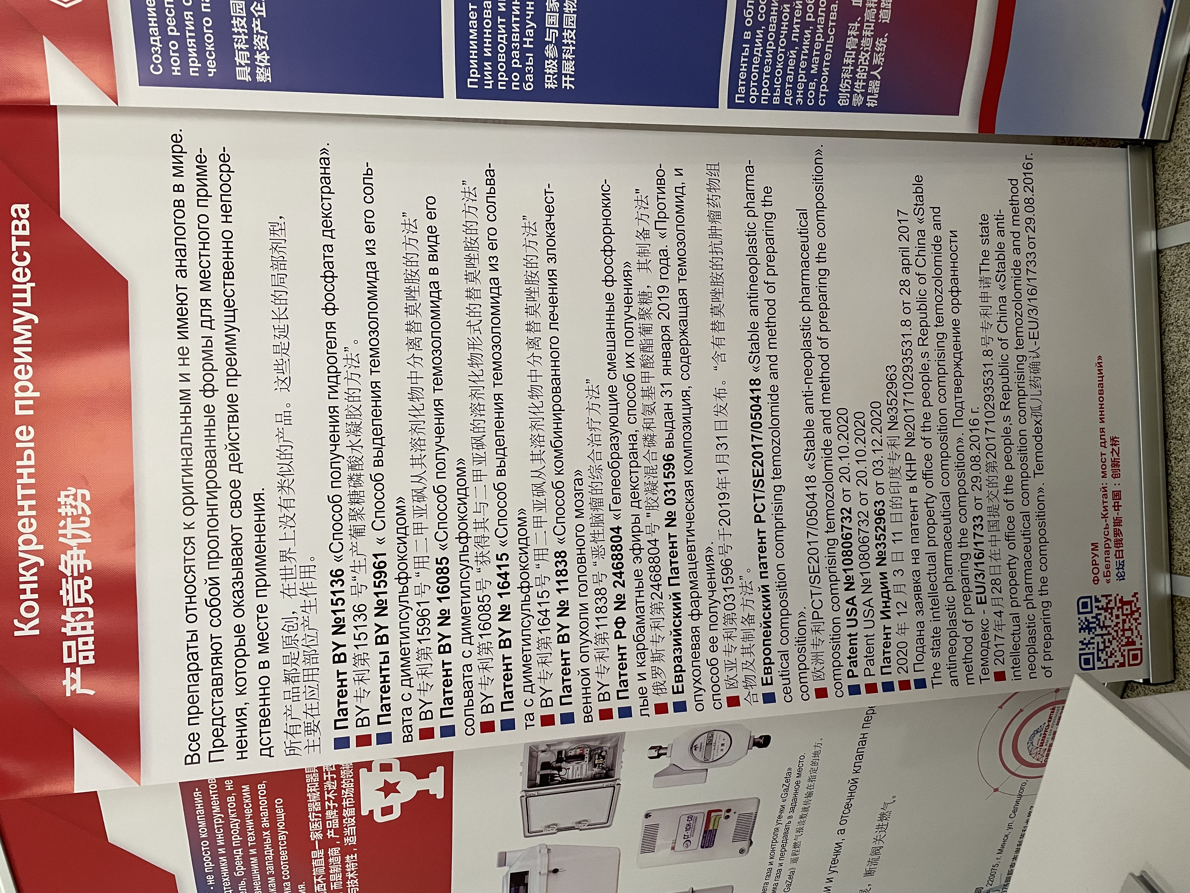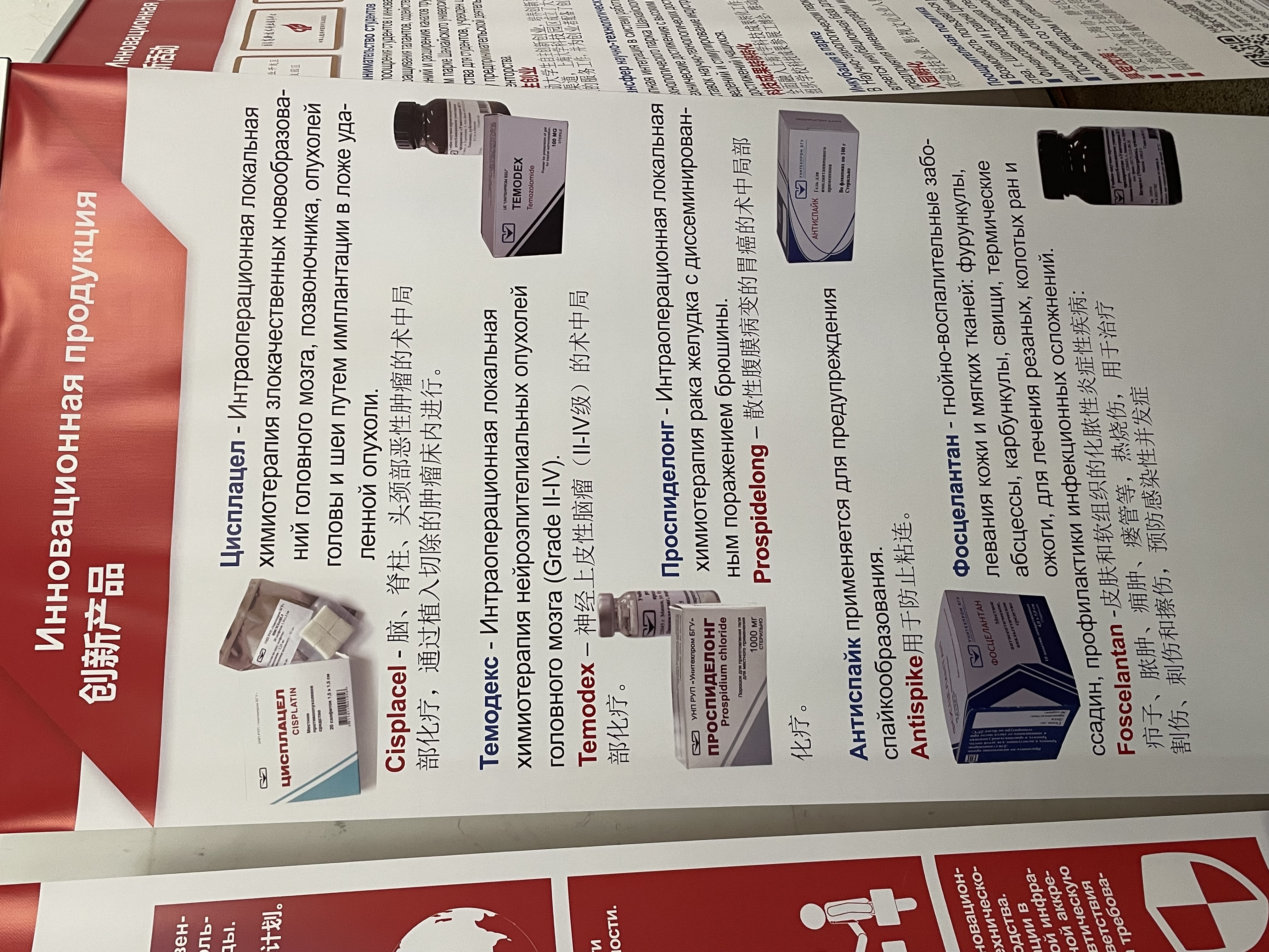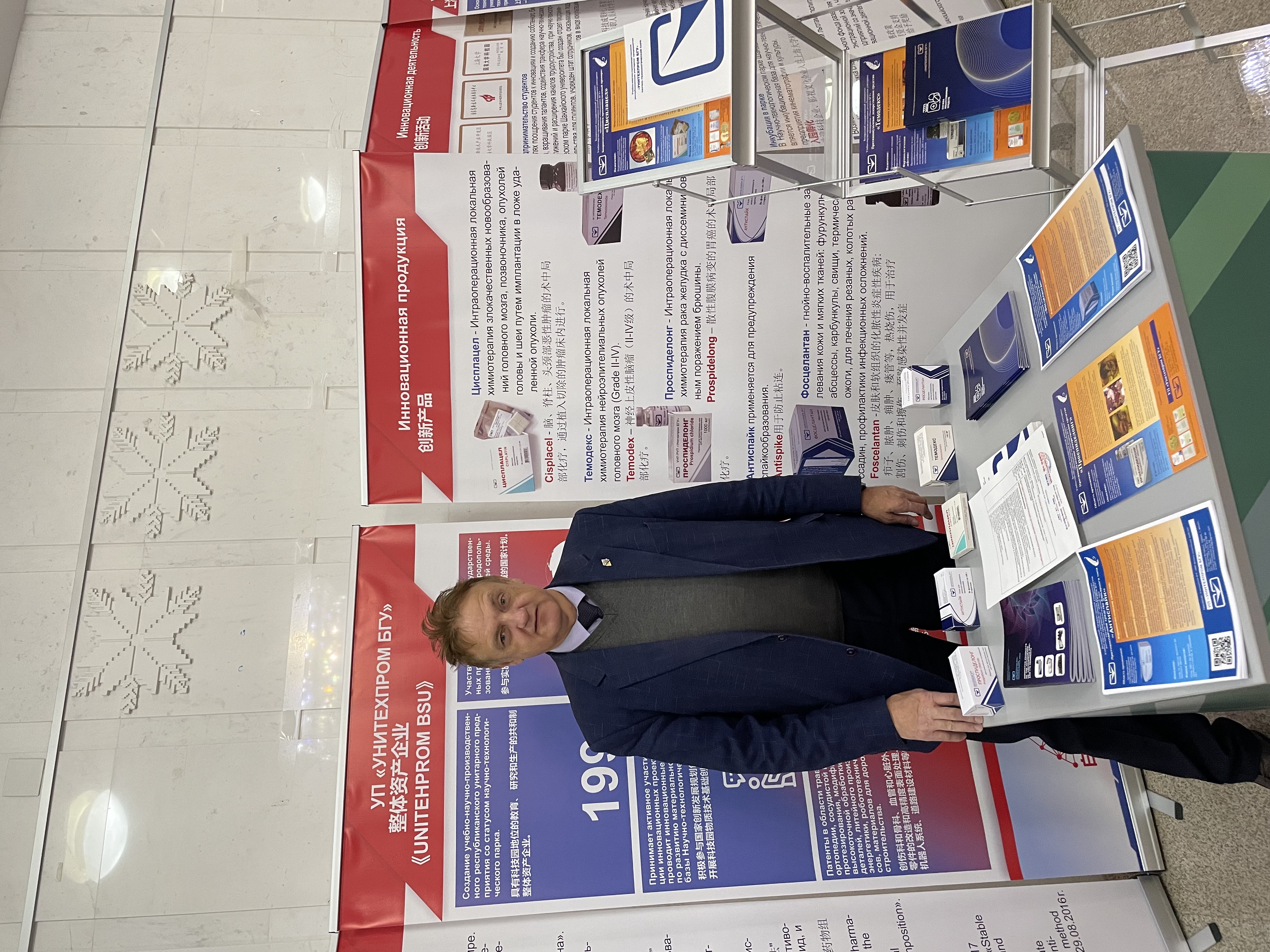 На выставке сотрудниками УП «УНИТЕХПРОМ БГУ» директором Бычковским П. М. и начальником сектора регистрации СЛС Левченко И. А. была представлена продукция предприятия: Оригинальные противоопухолевые лекарственные препараты: «Цисплацел», «Темодекс» и «Проспиделонг»; Антисептический лекарственный препарат, способствующий улучшению регенерации «Фосцелантан»; Противоспаечное средство барьерного типа «Антиспайк».