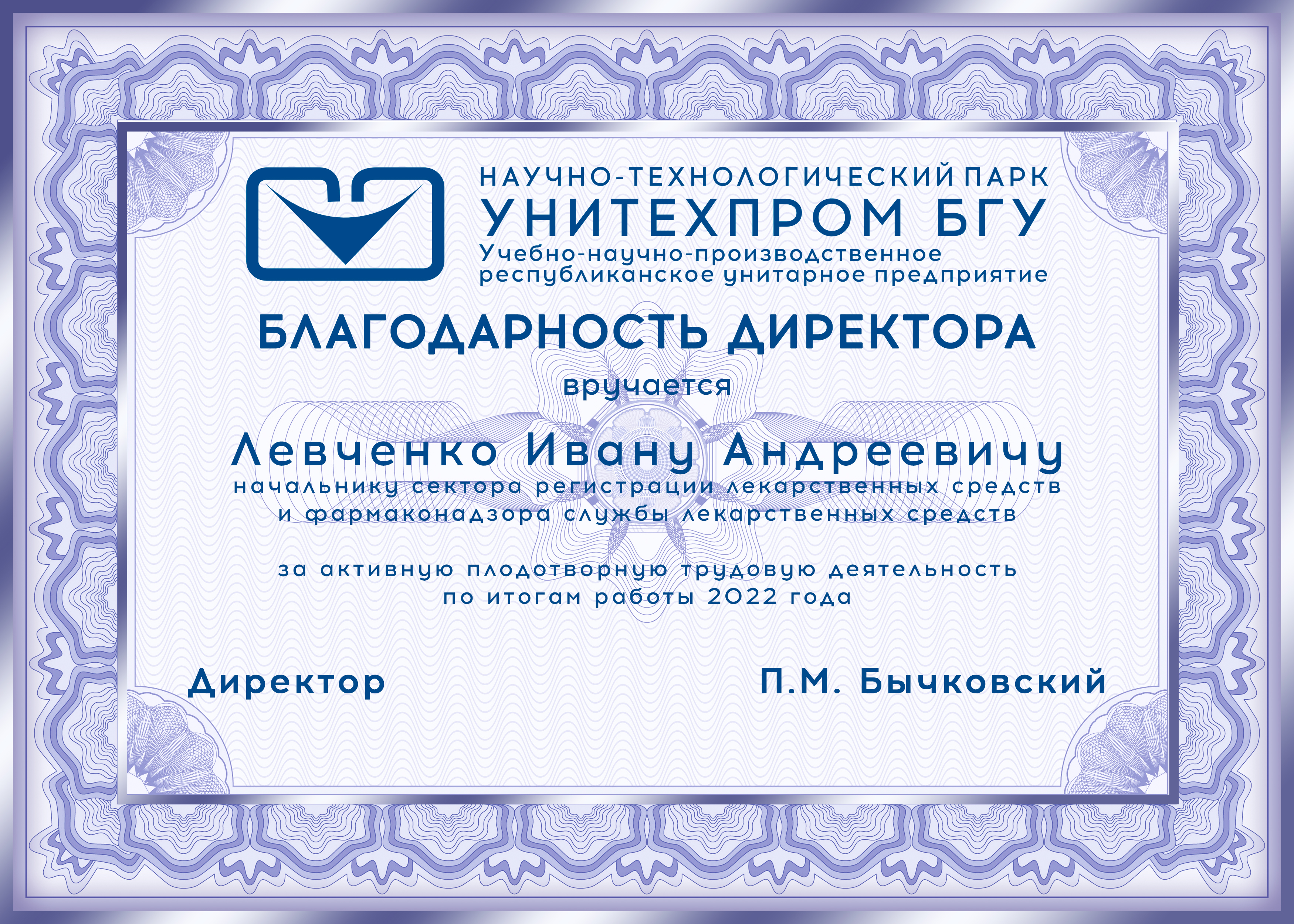 За активную плодотворную трудовую деятельность по итогам работы 2022 года Благодарностью директора УП «УНИТЕХПРОМ БГУ» отмечены следующие сотрудники предприятия: