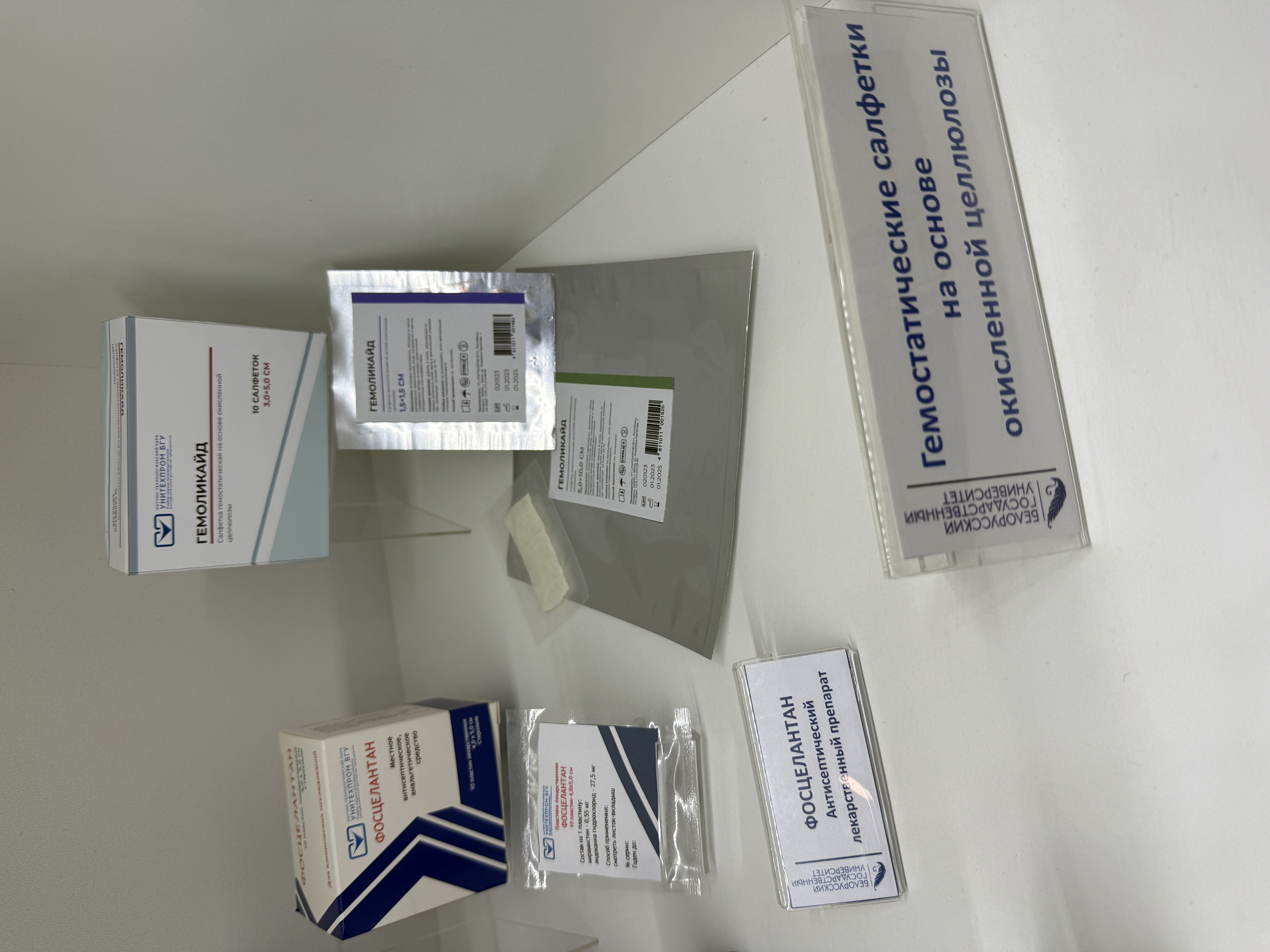 На коллективном стенде были представлены экспонаты: изделие медицинского назначения «Гемоликайд», биоразлагаемые салфетки и оригинальный лекарственный препарат «Фосцелантан», пластина лекарственная.