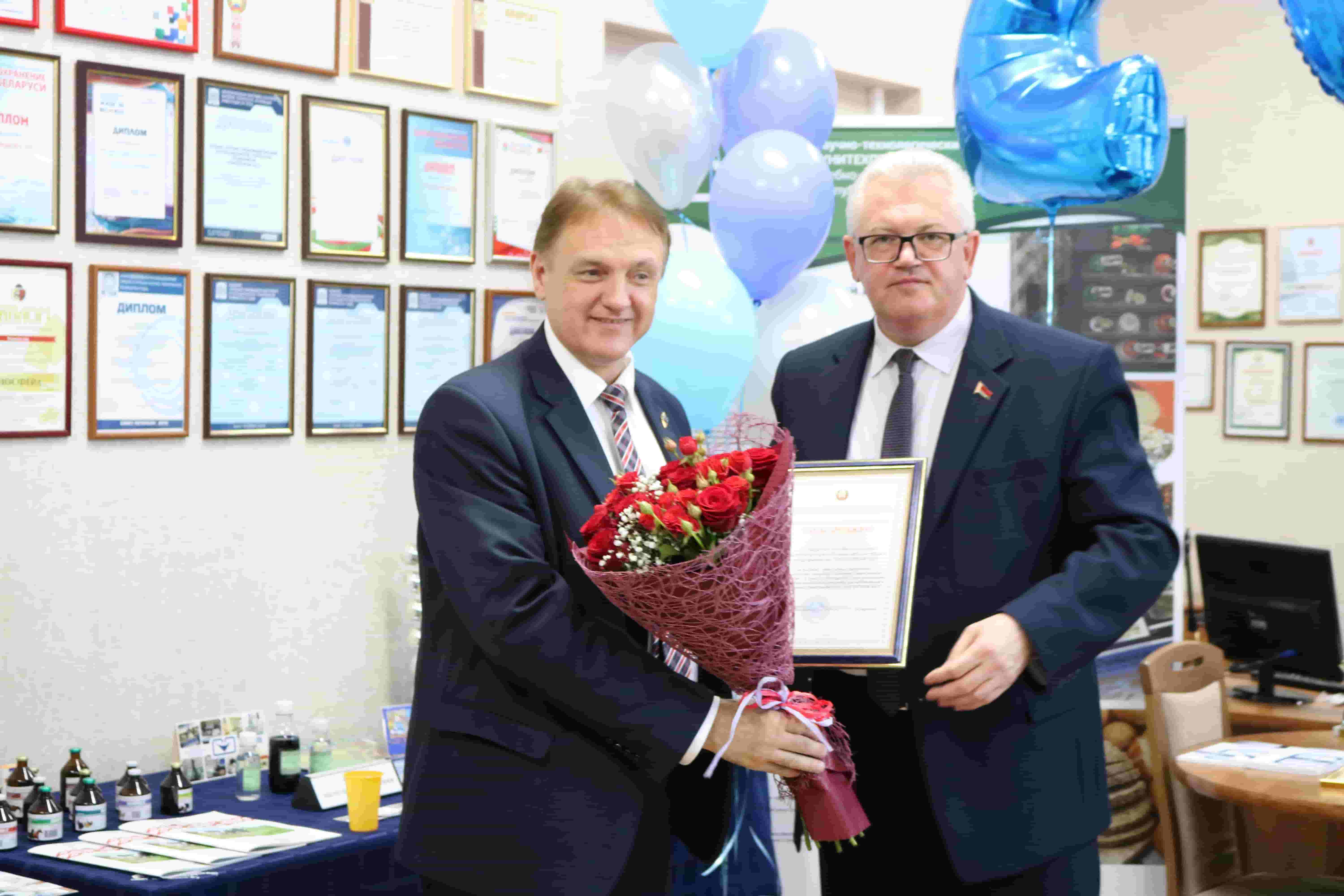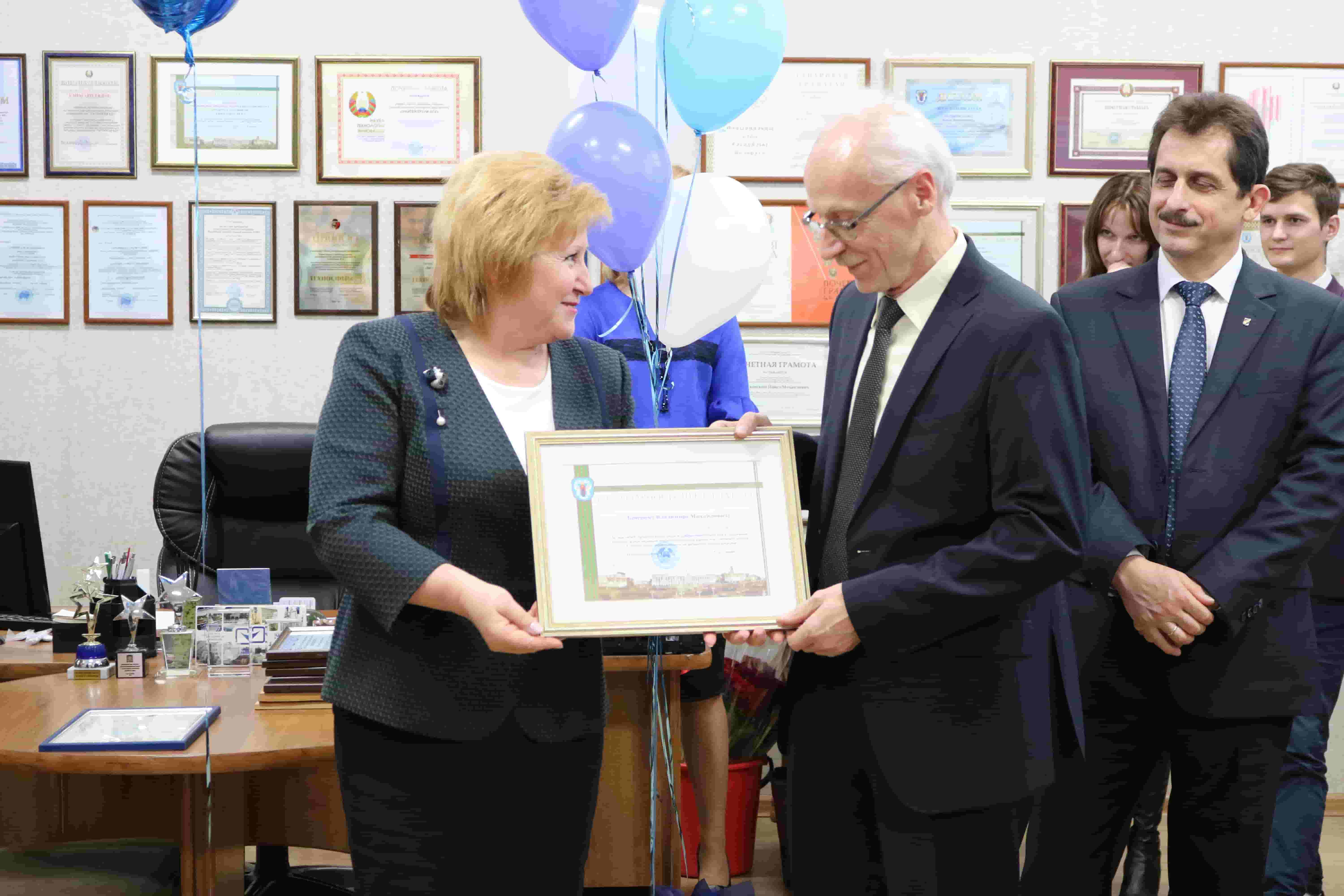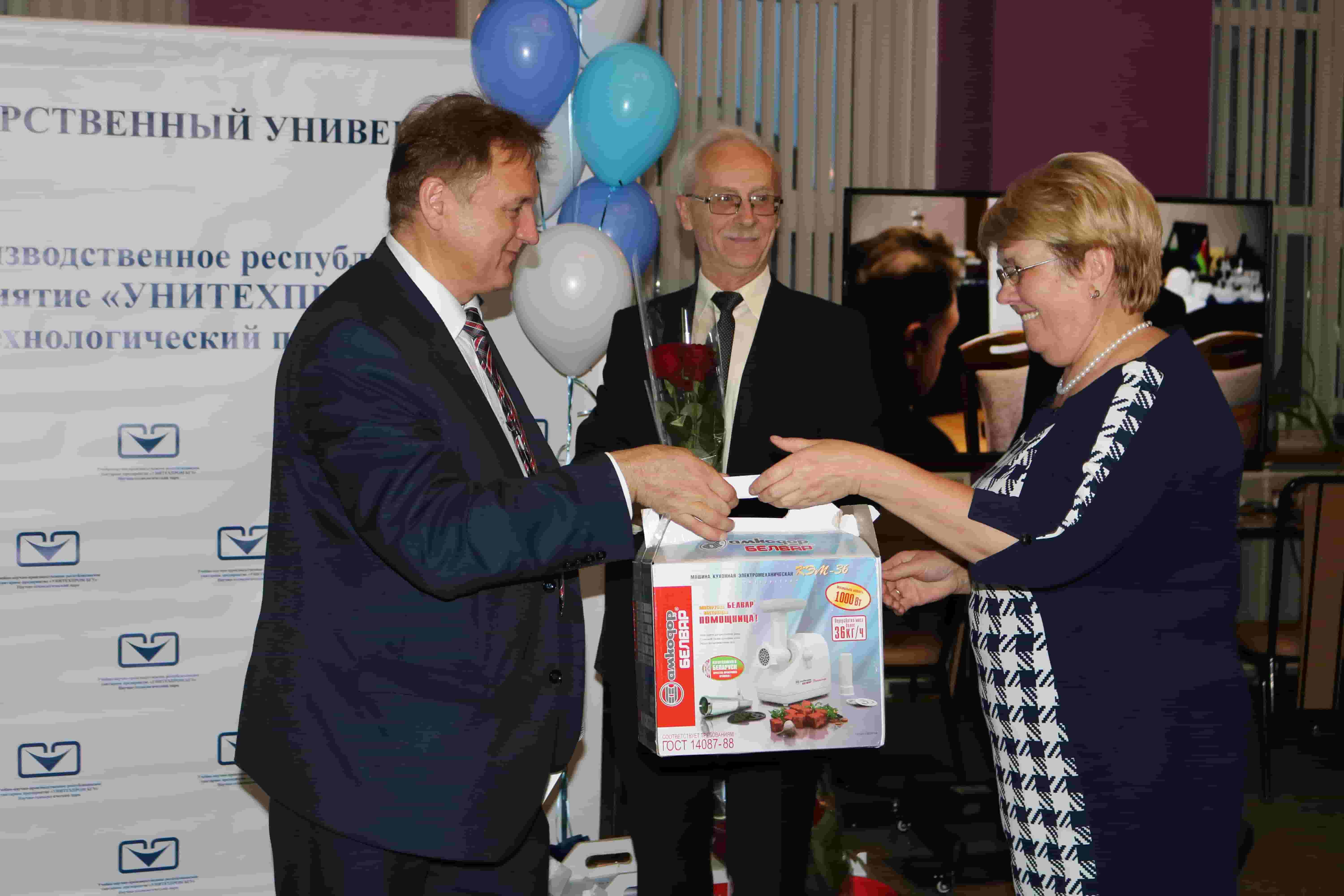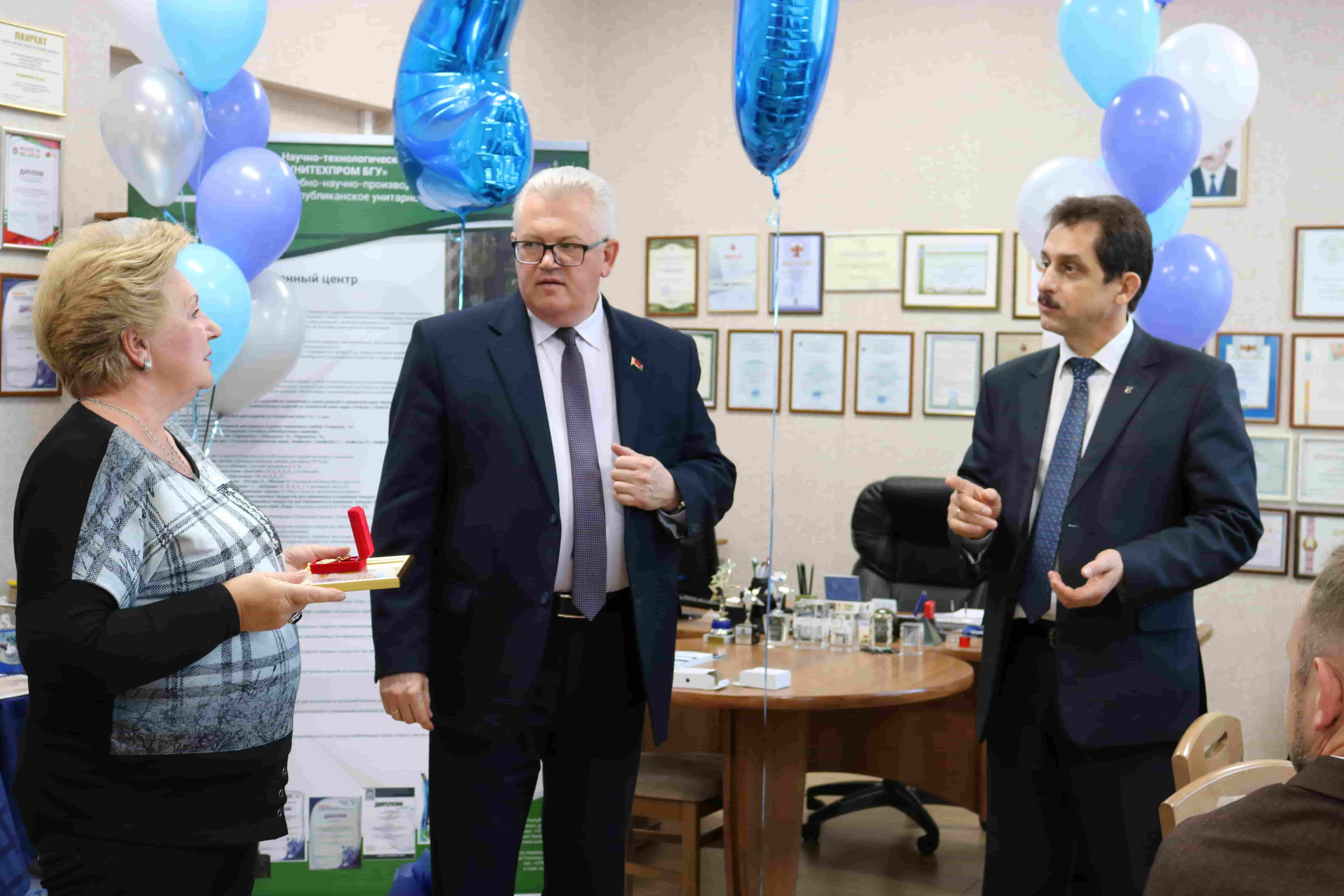 Ознакомились с работой участка прототипирования, производством фармацевтических субстанций и оригинальных лекарственных средств на УП «УНИТЕХПРОМ БГУ». Посетили производственные участки УП «УНИДРАГМЕТ БГУ». Министр образования наградил: почетной грамотой коллектив УП «УНИТЕХПРОМ» «За высокiя i эфекртыўныя дасягненни ў навуковай, навукова-тэхнiчнай i iнавацыйнай сферах i ў сувязи з 20-годдзем з дня заснавання вучэбна-навукова-вытворчага рэспублiканскага ўнiтарнага прадпрыемства «УНIТЭХПРАМ БДУ», нагрудными знаками «Отличник образования» Бычковского Павла Михайловича и Юркштович Татьяну Лукиничну Проведена демонстрация производимой продукции на УП «УНИТЕХПРОМ БГУ» и его резидента НПЦ «ПроБиоТех». Обсудили вопросы деятельности и развития УП «УНИТЕХПРОМ БГУ» со статусом научно-технологического парка, окупаемости созданных производственных участков, реализации инновационной продукции. Министр дал ряд поручений. Предприятие посетила Глава администрации Московского района города Минска Колядко Татьяна Ивановна, ознакомилась с выставочной экспозицией продукции, поздравила коллектив с 20-летием предприятия. Вручение благодарности Председателя Мингорисполкома Ломскому Владимиру Михайловичу От имени БГУ коллектив поздравил проректор по научной работе Сафонов В.Г. и вручил награды сотрудникам УП «УНИТЕХПРОМ БГУ» Директор Бычковский П.М. поздравил коллектив, обьявил благодарности и вручил ценные подарки сотрудникам УП «УНИТЕХПРОМ БГУ».