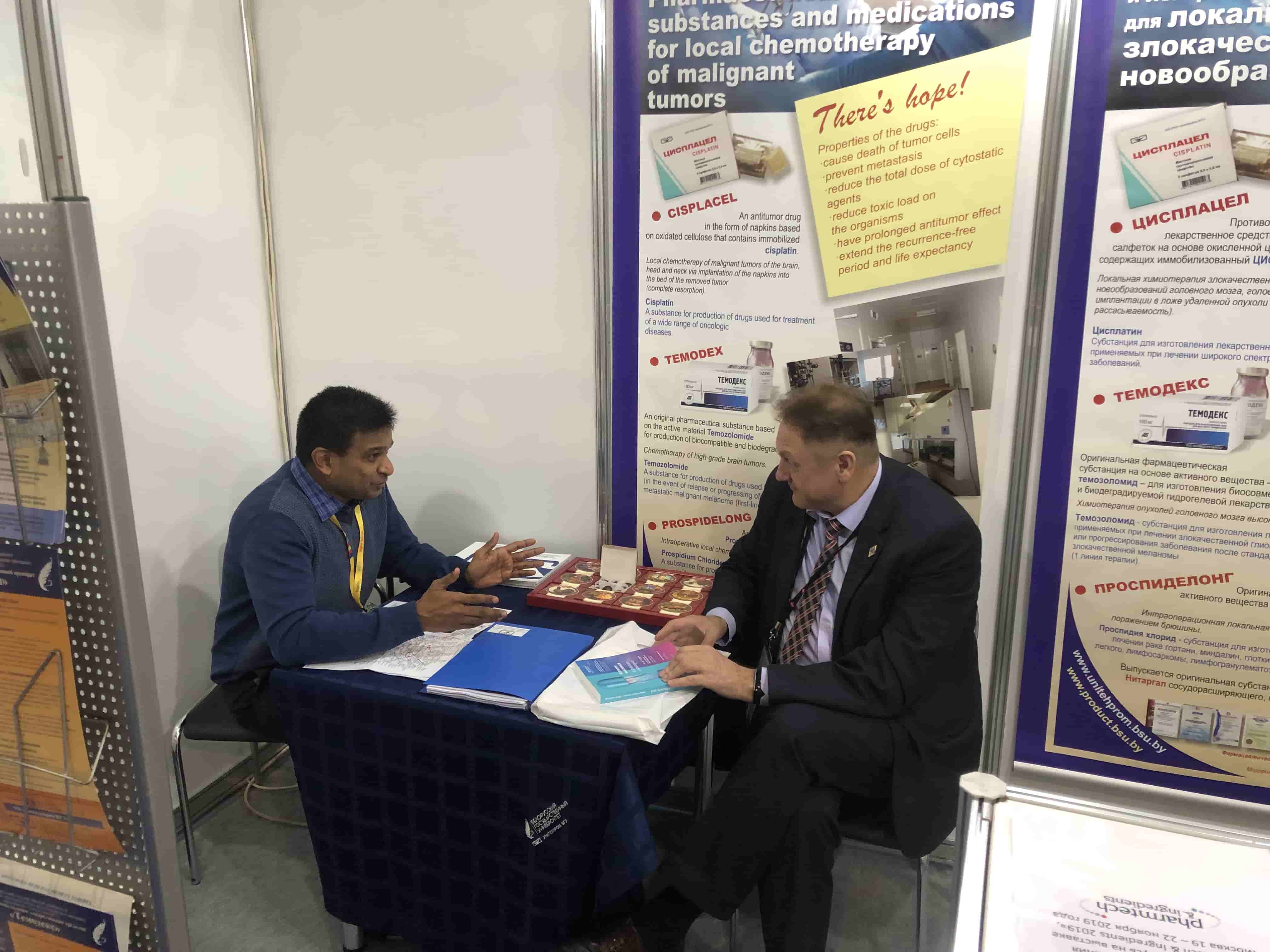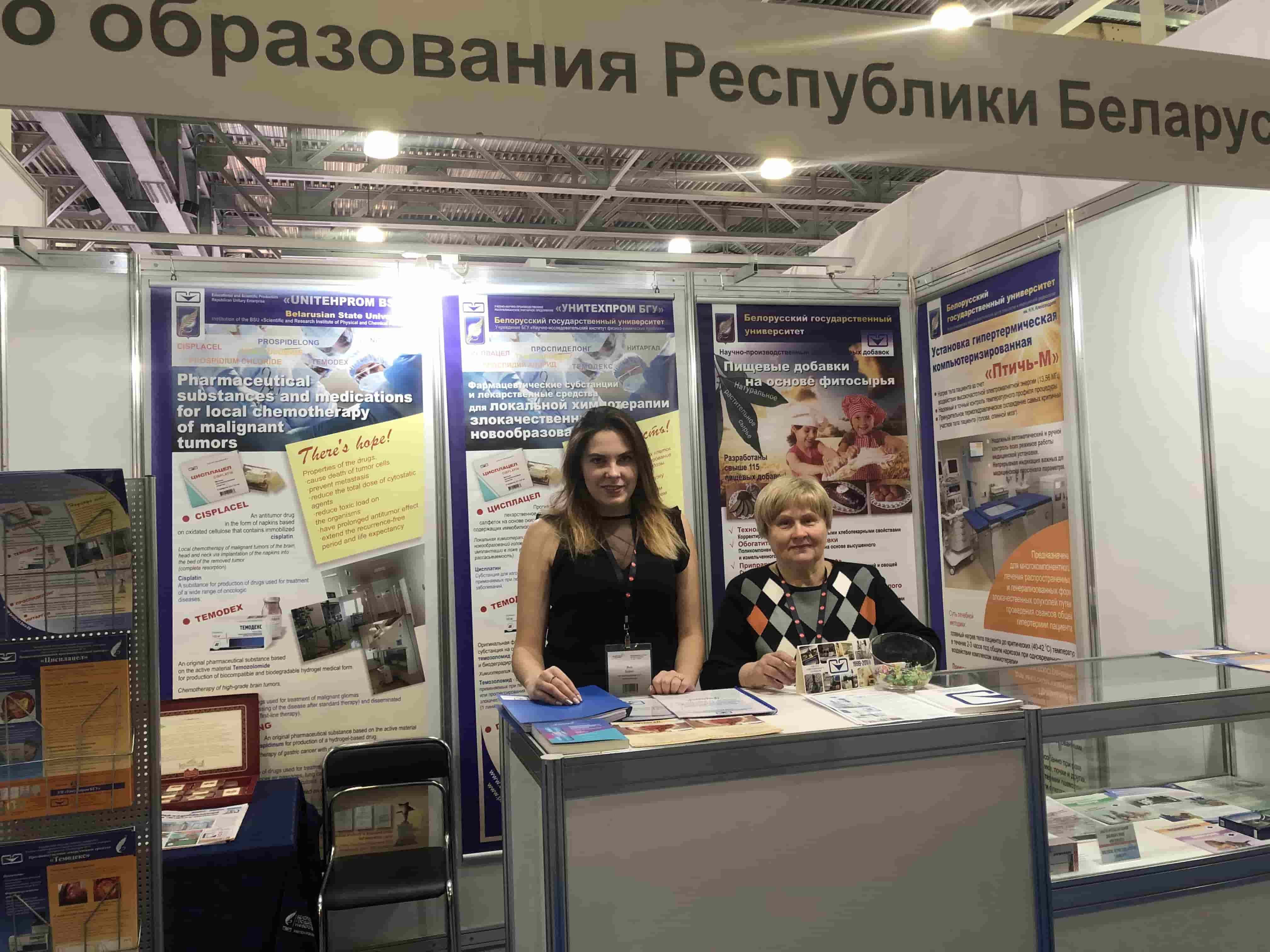 Представители УП «УНИТЕХПРОМ БГУ» приняли участие в работе коллективного стенда Министерства образования на 21-ой Международной выставке оборудования, сырья и технологий для фармацевтического производства «Pharmtech & Ingredients 2019». На стенде была представлена следующая продукция, выпускаемая УП «УНИТЕХПРОМ БГУ»: 1. Фармацевтические субстанции противоопухолевого действия Темозоломид, Темодекс, Проспидия хлорида и Проспиделонг. 2. Фармацевтическая субстанция кардиотропного действия Нитаргал. 3. Оригинальные препараты противоопухолевого действия Темодекс, Проспиделонг и Цисплацел. 4. Обогатительные добавки для производства функциональных хлебопекарных и мясных пищевых продуктов, витаминно-минеральные премиксы серии «Арбарвит», фитокомпозиции обогатительные селеносодержащие серии «Аврора», фитосоли; 5. Установка гипертермическая компьютеризированная «Птичь-М». 6. Спирометр МАС-1. 7. Инновационные ветеринарные препараты, предназначенные для предотвращения заболеваний и лечения животных, выпускаемые резидентом технопарка –ООО «НПЦ «ПРОБИОТЕХ» Гостей стенда подробно ознакомили с интересующей продукцией и технологиями, разработанными учеными БГУ, обсудили возможности и условия их приобретения, а также налаживания совместного производства. В ходе работы выставки было проведено более 50 переговоров с представителями предприятий, организаций, научных учреждений, деловых кругов, частными лицами Российской Федерации и других стран. Подписаны соглашение о конфиденциальности и протокол о намерениях между ООО КонФар (г. Москва, РФ) и УП «УНИТЕХПРОМ БГУ» о продвижении лекарственного средства Цисплацел на территории РФ. Подписан протокол о намерениях между ООО «Фирма «ВИПС-МЕД» и УП «УНИТЕХПРОМ БГУ» на участие в конкурсе на изготовление комплекта чистых помещений, инженерных сетей, а также по изучению вопроса по проведению регистрации ЛС Цисплацел. Участие в выставке позволило продемонстрировать потенциальным партнерам из Российской Федерации и соседних государств высокий уровень научного и инновационного потенциала организаций, входящих в структуру Министерства образования, широкий спектр научных и технических направлений деятельности, а также представить всем заинтересованным подробную информацию о демонстрируемой продукции, разъяснить особенности оборудования, материалов, технологий и их преимущества.
