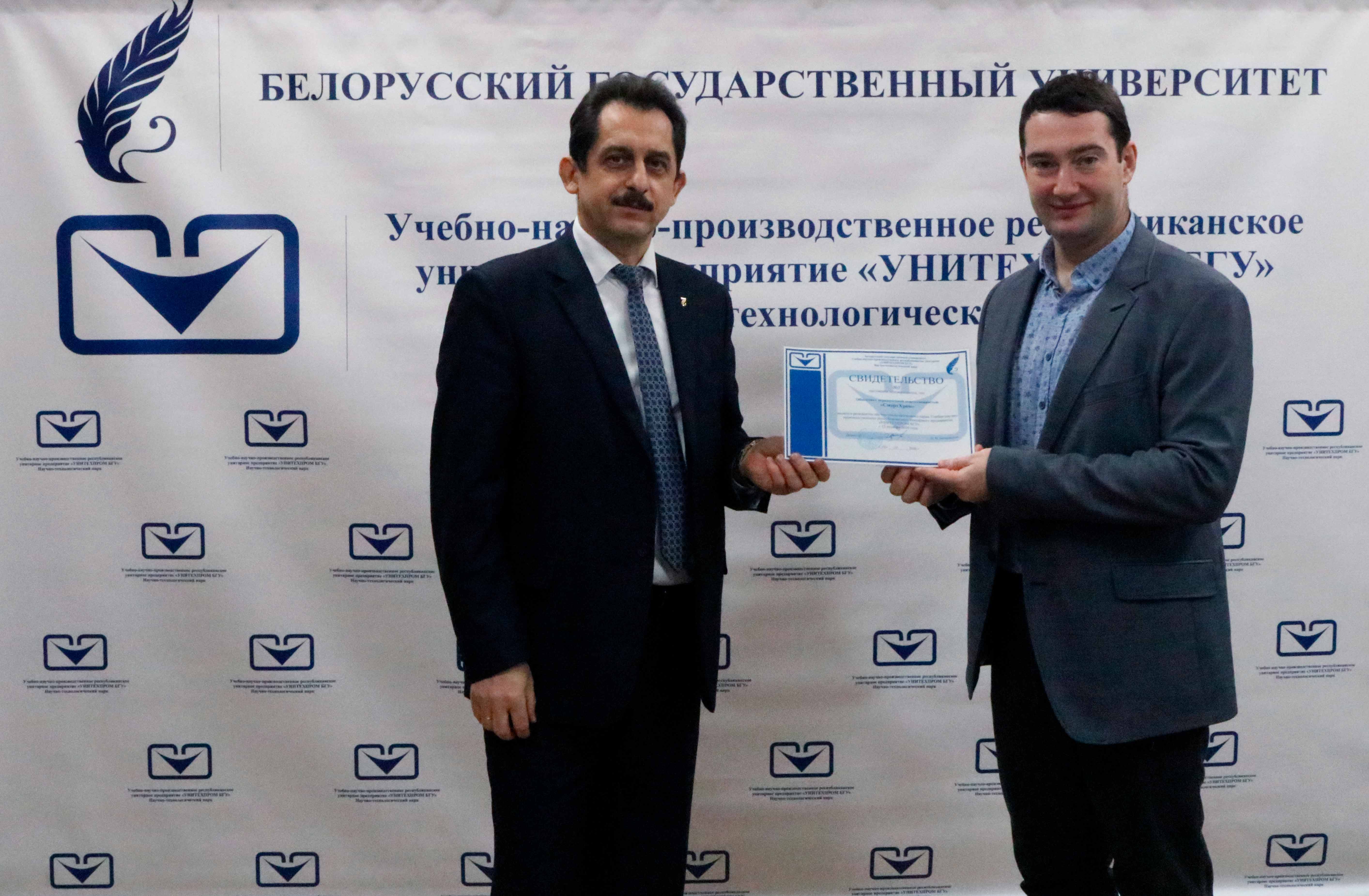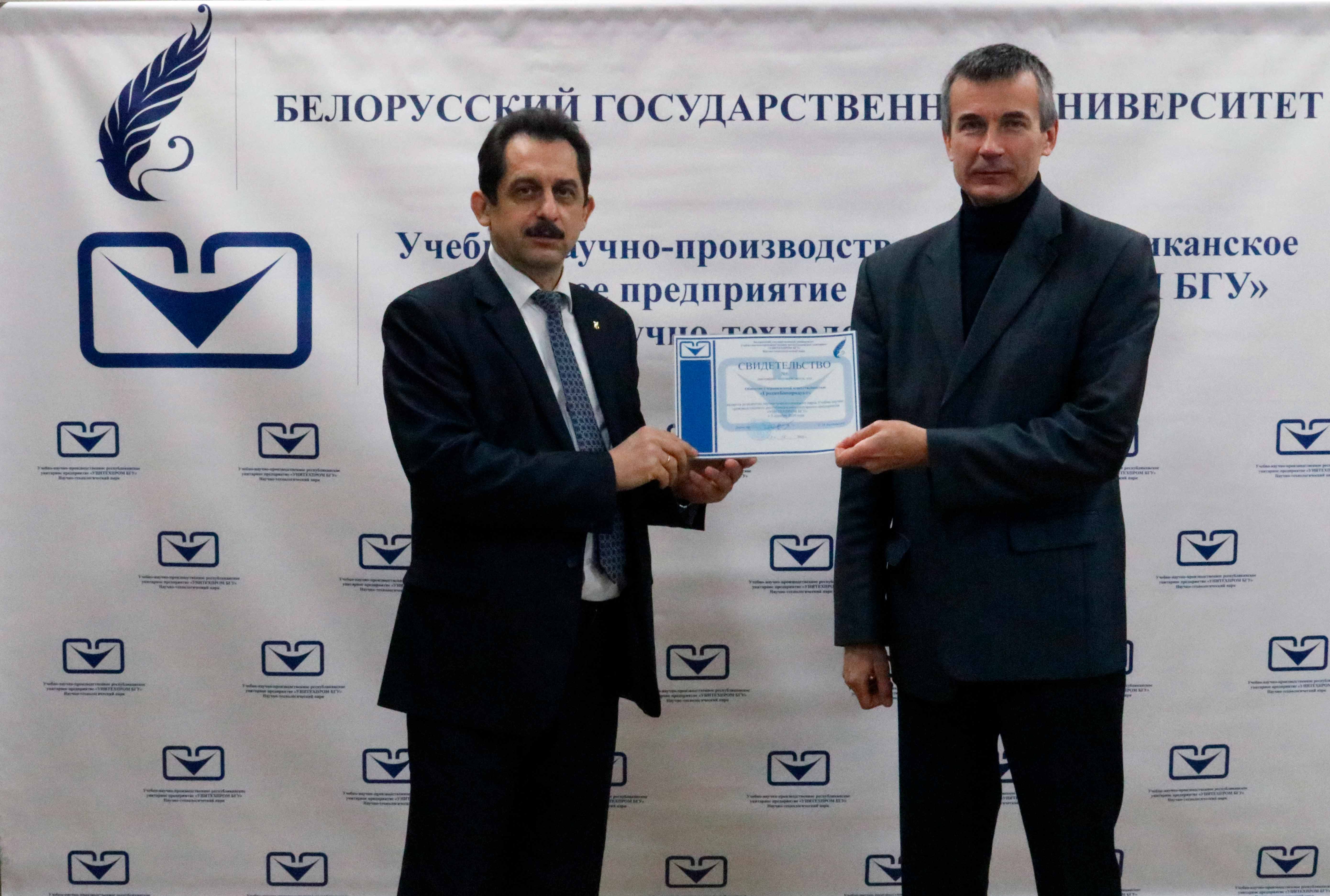 В рамках заседания проректор по научной работе БГУ Сафонов В.Г. в торжественной обстановке вручил директору ООО «Альгимед Техно» Лютынскому В.В., заместителю директора ООО «ГродноБиопродукт» Лапко С.Л. и директору ООО «СмартХром» Свиридову И.А. свидетельства резидента научно-технологического парка УП «УНИТЕХПРОМ БГУ».