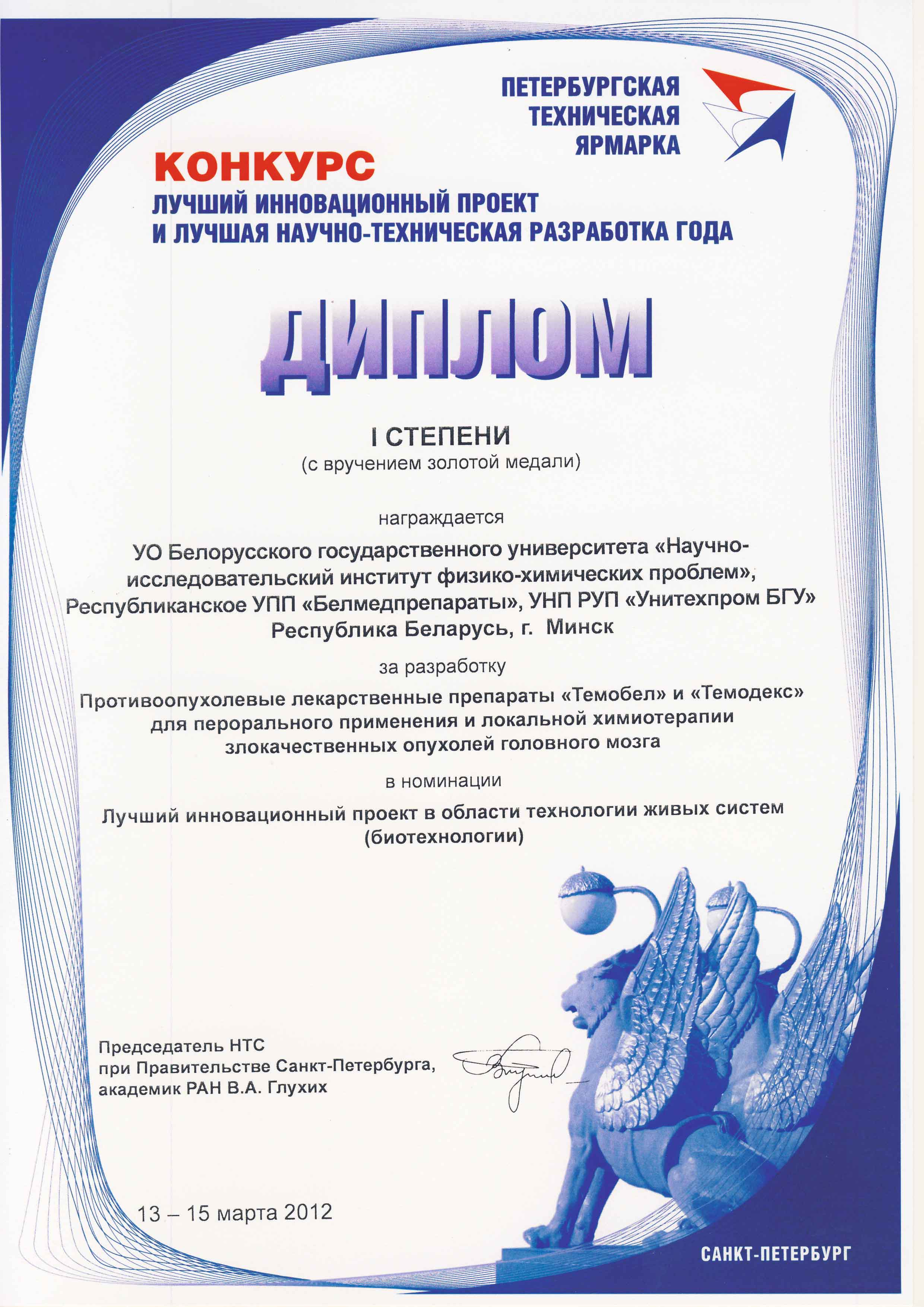 Препарат награжден дипломом 1 степени и золотой медалью «Петербургской технической ярмарки», г. Санкт-Петербург, 2012 г.