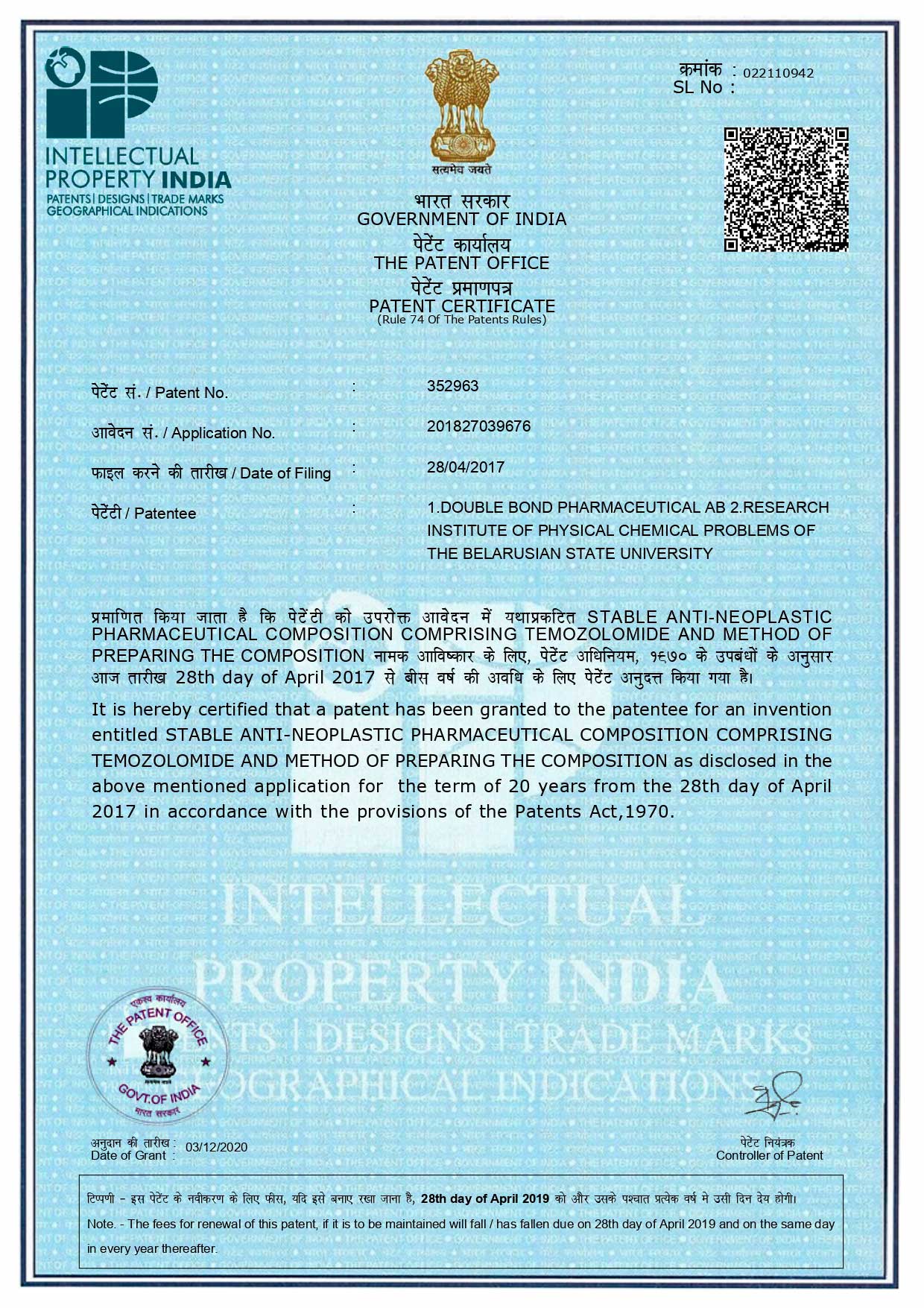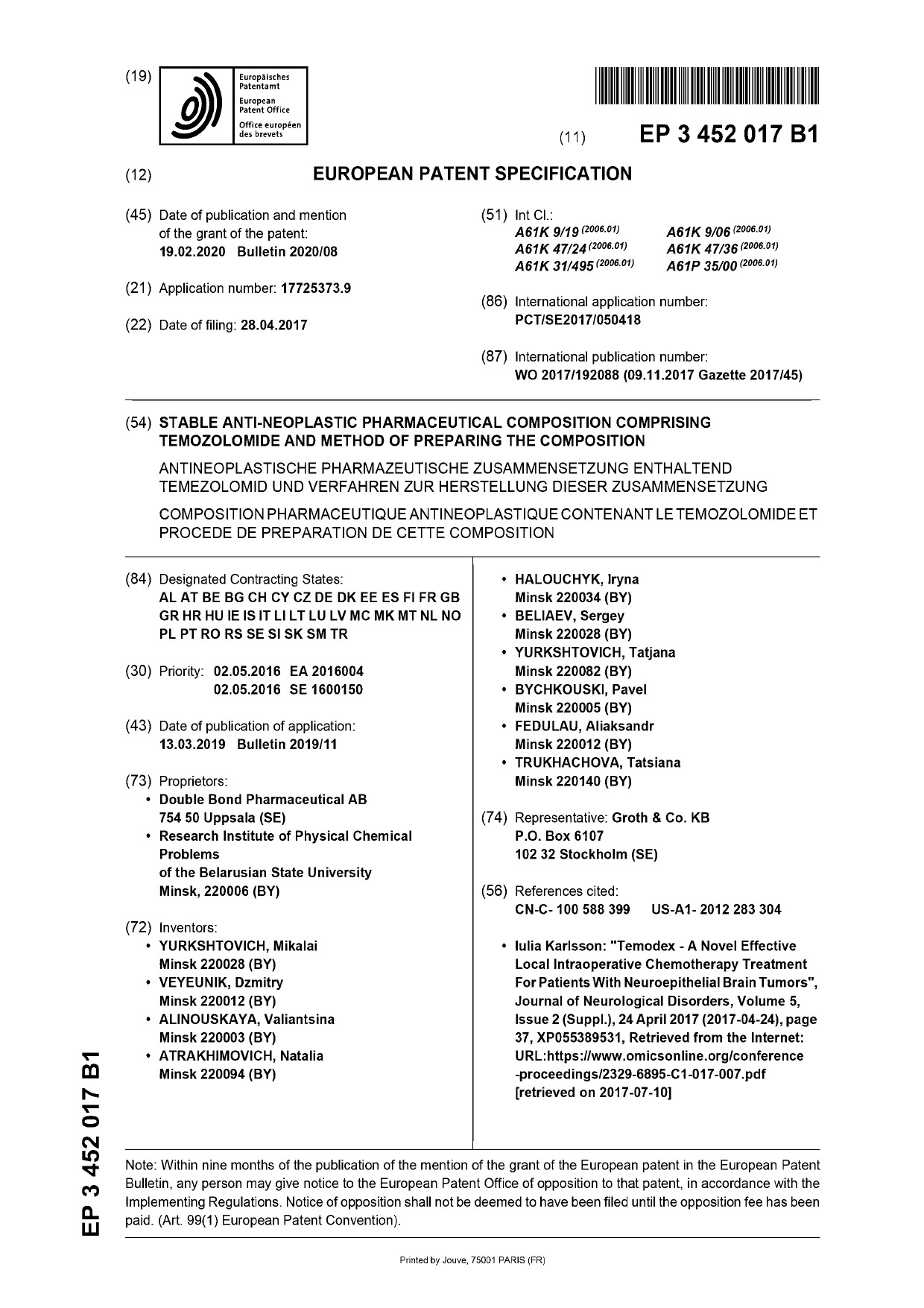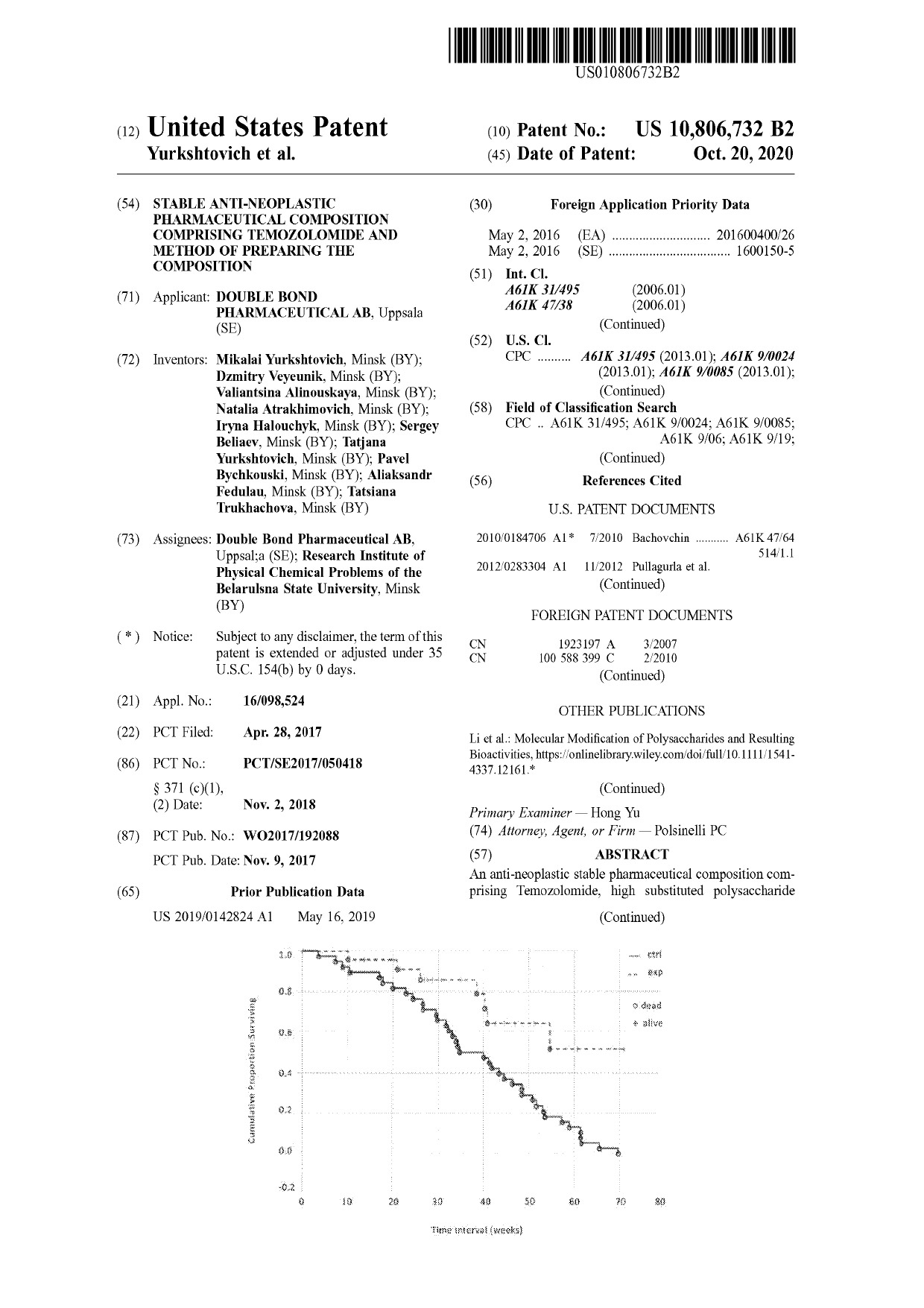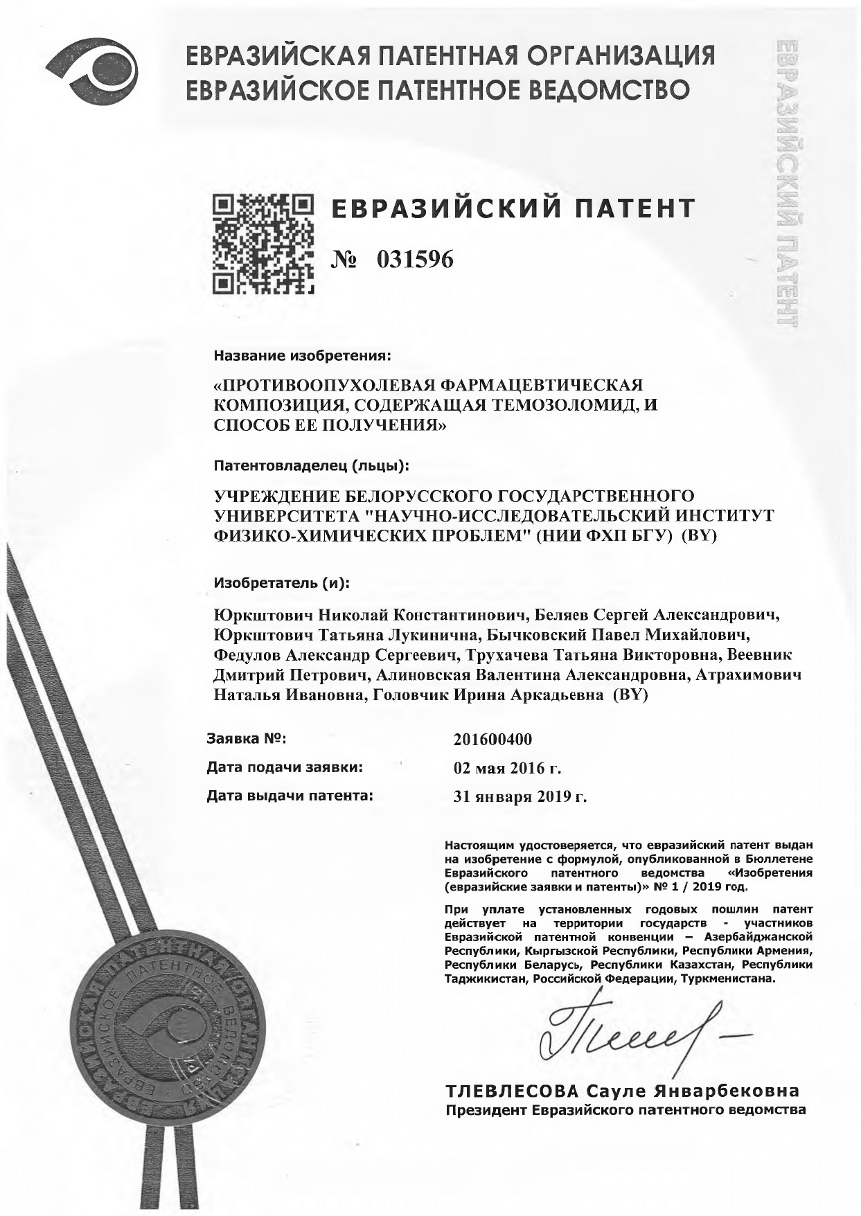 Лекарственное средство (ЛС) «Темодекс» является первой в мире гидрогелевой терапевтической системой для локальной химиотерапии злокачественных опухолей головного мозга. В клинических учреждениях Республики Беларусь в ходе проведения клинических испытаний и последующего применения после регистрации была показана эффективность: однократное интраоперационное применение Темодекса у пациентов с опухолями головного мозга увеличивает кумулятивную выживаемость и в 2-3 раза уменьшает риск рецидива опухоли в сравнении со стандартным лечением. ЛС Темодекс имеет патентную защиту в мире, а также регистрацию товарного знака «Темодекс» (свидетельство №59308), владельцем которого является НИИ ФХП БГУ.