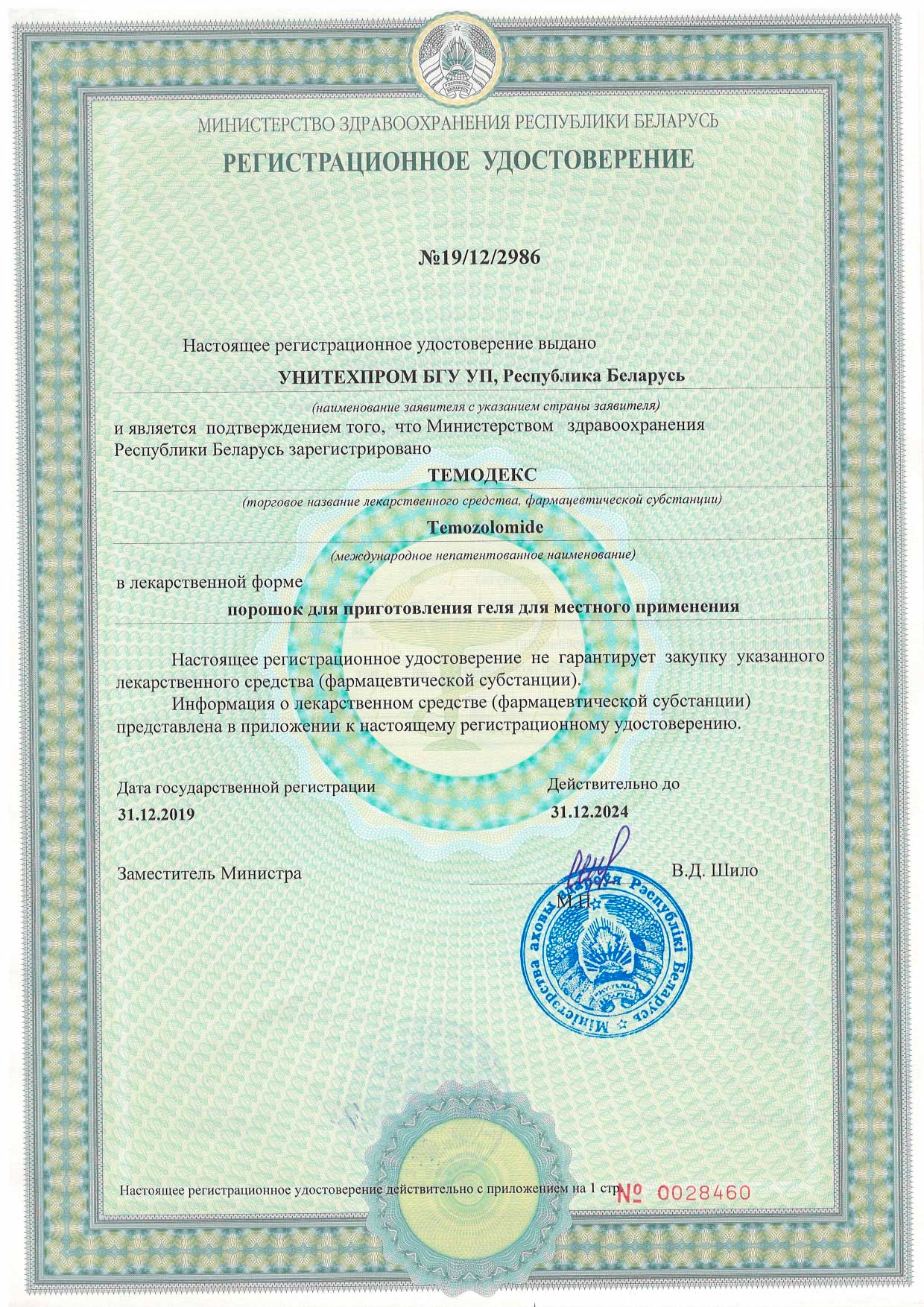 Справка. Оригинальный Лекарственный препарат Темодекс, порошок для приготовления геля для местного применения, 100 мг, во флаконах в упаковке №1 – противоопухолевое средство пролонгированного действия для местного применения, представляющее собой темозоломид, иммобилизованный на полимерный носитель – фосфат декстрана натриевую соль. Препарат применяют интраоперационно при проведении химиотерапии злокачественных опухолей головного мозга, которые не подлежат радикальному удалению вследствие особенностей биологического роста, с целью локального цитотоксического воздействия на остаточную опухолевую ткань и предотвращения рецидива и продолженного роста опухоли. Показаниями к применению препарата являются: впервые выявленная мультиформная глиобластома (в составе комбинированного лечения с лучевой терапией); злокачественная глиома (мультиформная глиобластома или анапластическая астроцитома). Регистрационное удостоверение №20/06/2986 от 31.12.2019.