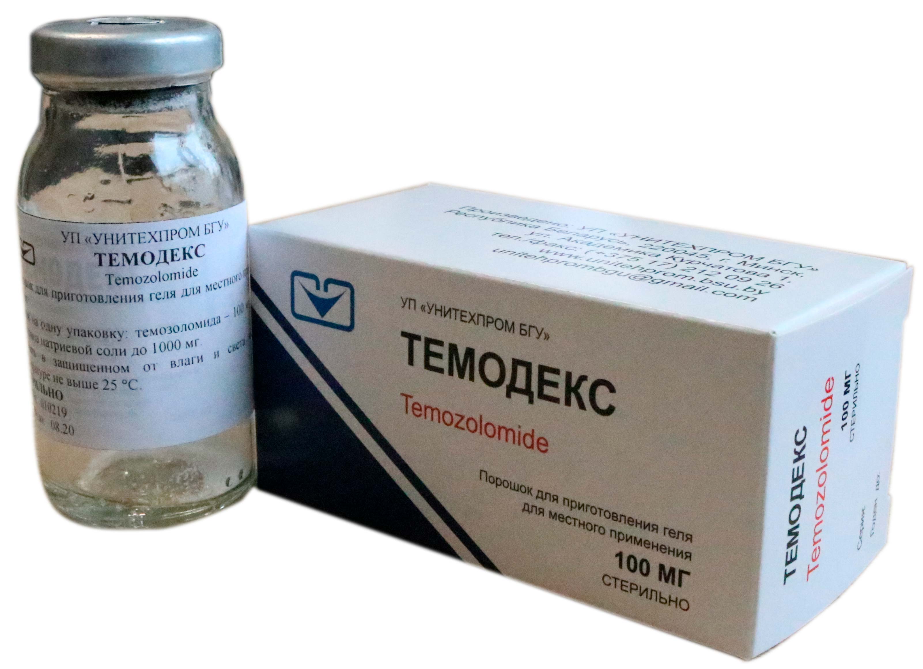 УП «УНИТЕХПРОМ БГУ» осуществляют выпуск оригинального лекарственного препарата Темодекс по полному циклу в Республике Беларусь, включая получение активного вещества (дженерическая фармацевтическая субстанция темозоломид) и гидрогелевого полимера-носителя (фосфат декстрана).